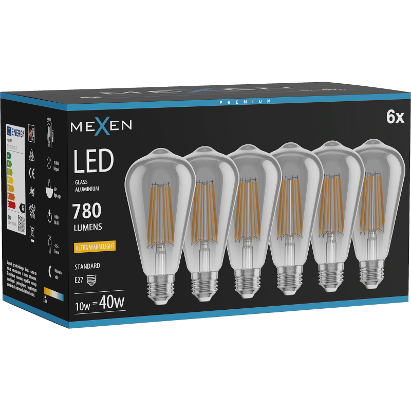 Mexen Vintis 6x żarówka filament LED E27, ST64, 10W, Ciepła - 2200K, 780 lm, smoke - L152-E27-1022-70x06