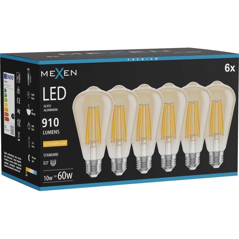 Mexen Vintis 6x żarówka filament LED E27, ST64, 10W, Ciepła - 2200K, 910 lm, amber - L152-E27-1022-50x06