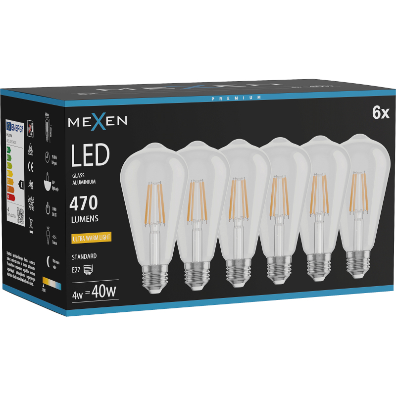 Mexen Vintis 6x żarówka filament LED E27, ST64, 4W, Ciepła - 2200K, 470 lm, clear - L152-E27-0422-00x06