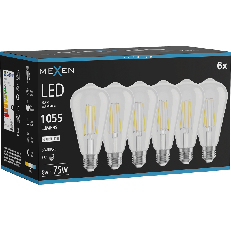Mexen Vintis 6x żarówka filament LED E27, ST64, 8W, Neutralna - 4000K, 1055 lm, clear - L152-E27-0840-00x06