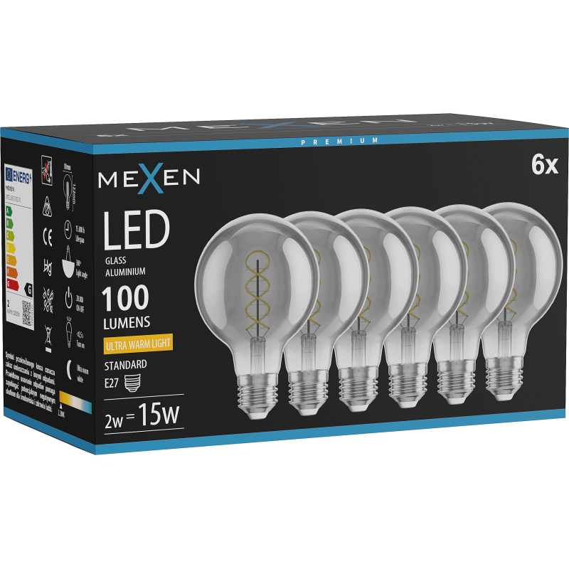 Mexen Vintis 6x żarówka filament spirala LED E27, G80, 2W, Ciepła - 2200K, 100 lm, smoke - L165-E27-0222-70x06