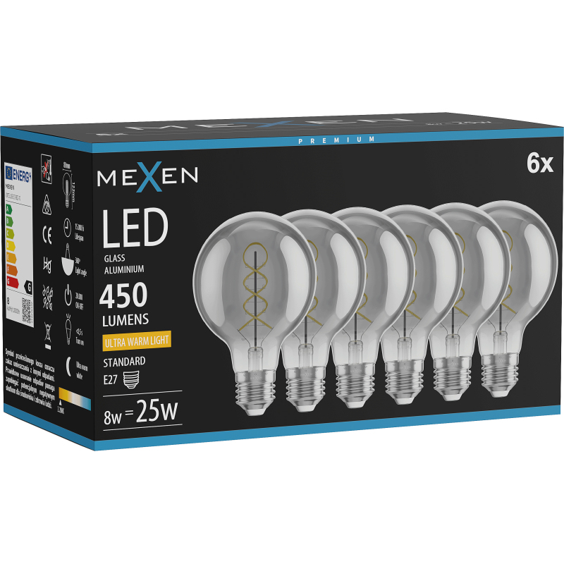 Mexen Vintis 6x żarówka filament spirala LED E27, G80, 8W, Ciepła - 2200K, 450 lm, smoke - L165-E27-0822-70x06