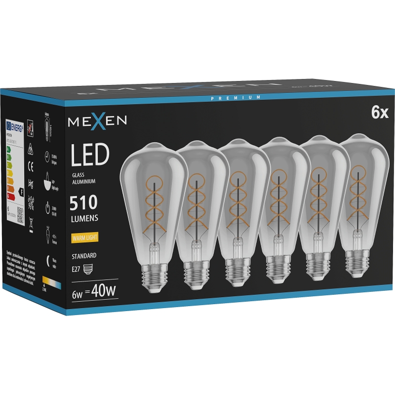Mexen Vintis 6x żarówka filament spirala LED E27, ST64, 6W, Ciepła - 2700K, 510 lm, smoke - L162-E27-0627-70x06