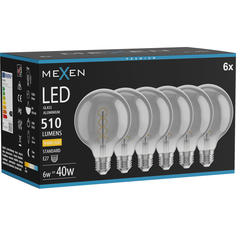 Mexen Vintis 6x LED spirálová žárovka E27, G95, 6W, teplá - 2700K, 510 lm, kouřová - L167-E27-0627-70x06