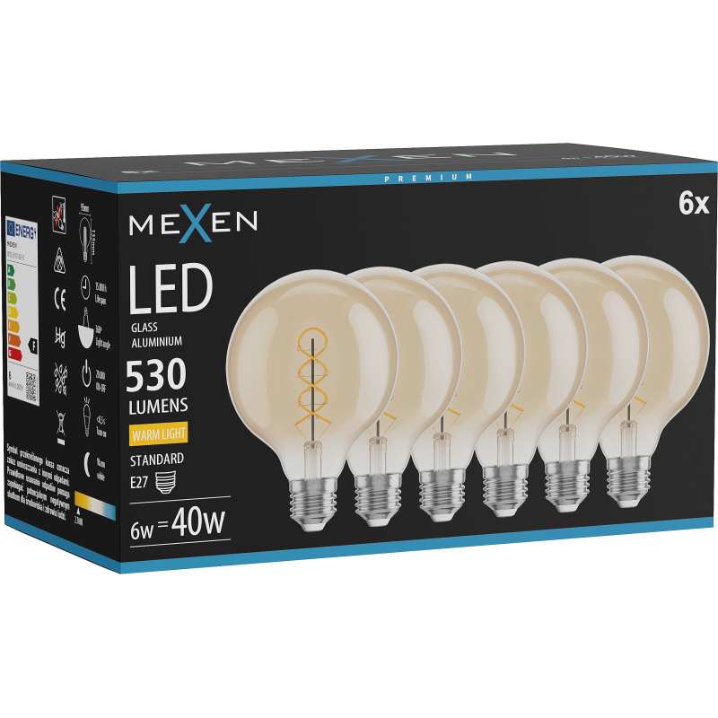 Mexen Vintis 6x LED spirálová žárovka E27, G95, 6W, teplá - 2700K, 530 lm, jantarová - L167-E27-0627-50x06