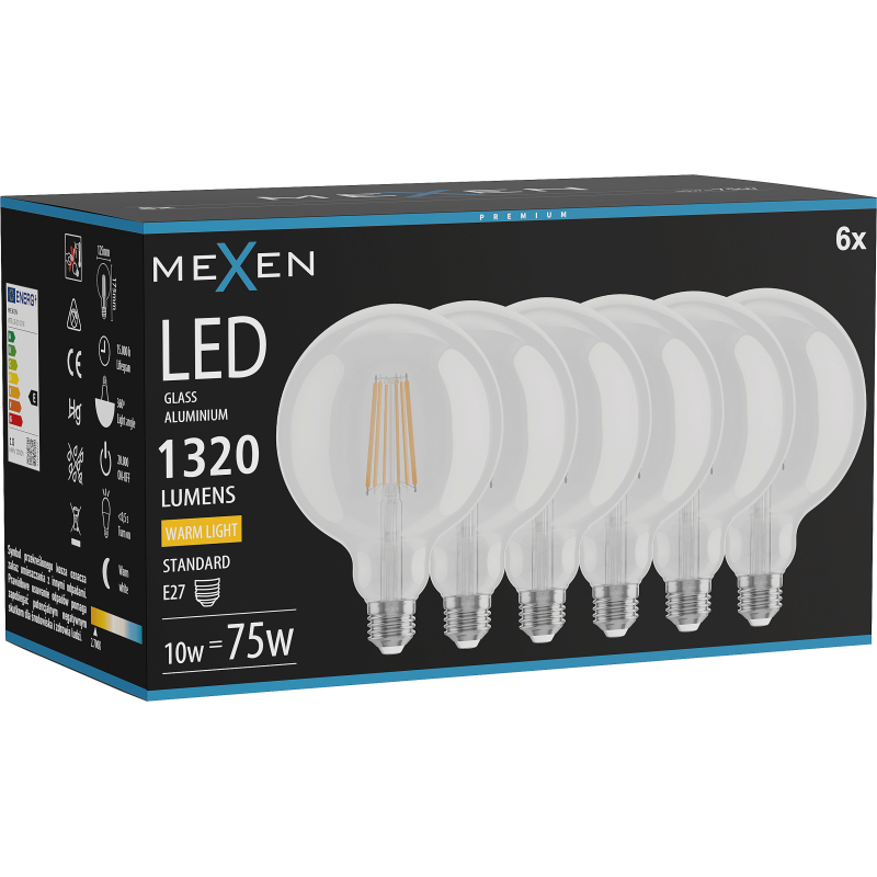 Mexen Vintis 6x LED žárovka s vláknem E27, G125, 10W, teplá - 2700K, 1320 lm, čirá - L158-E27-1027-00x06