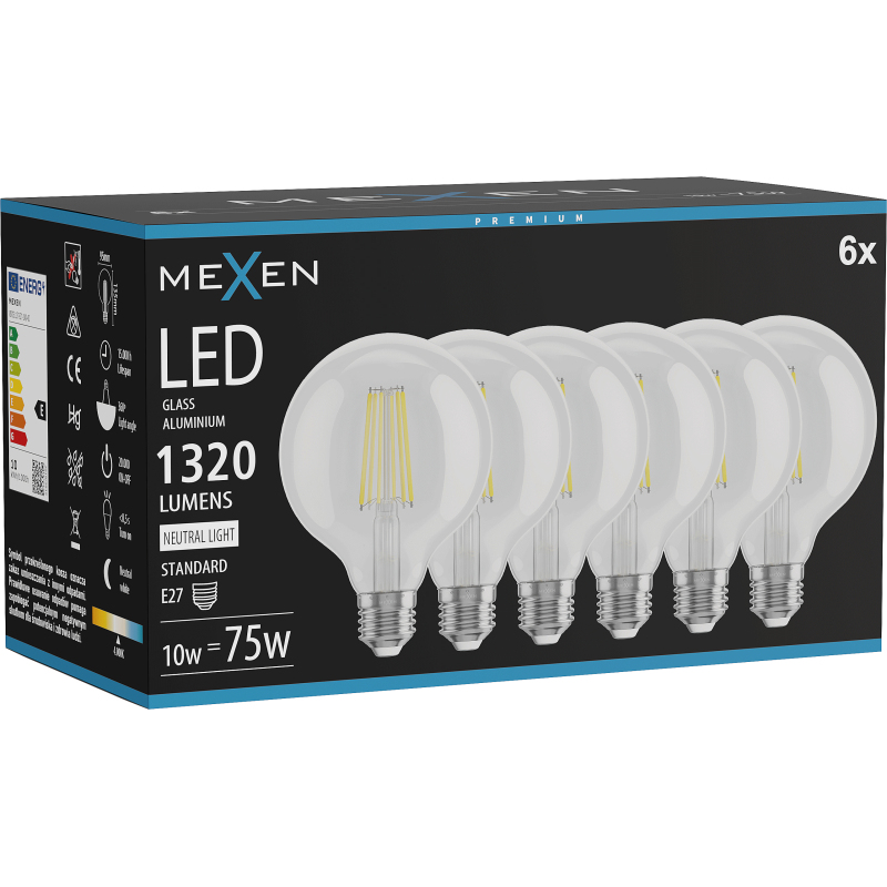 Mexen Vintis 6x LED žárovka s vláknem E27, G95, 10W, neutrální - 4000K, 1320 lm, čirá - L157-E27-1040-00x06