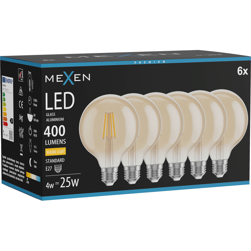 Mexen Vintis 6x LED žárovka s vláknem E27, G95, 4W, teplá - 2700K, 400 lm, jantarová - L157-E27-0427-50x06