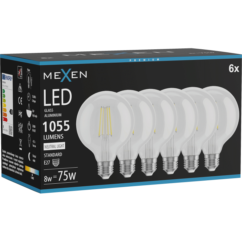 Mexen Vintis 6x LED žárovka s vláknem E27, G95, 8W, neutrální - 4000K, 1055 lm, čirá - L157-E27-0840-00x06