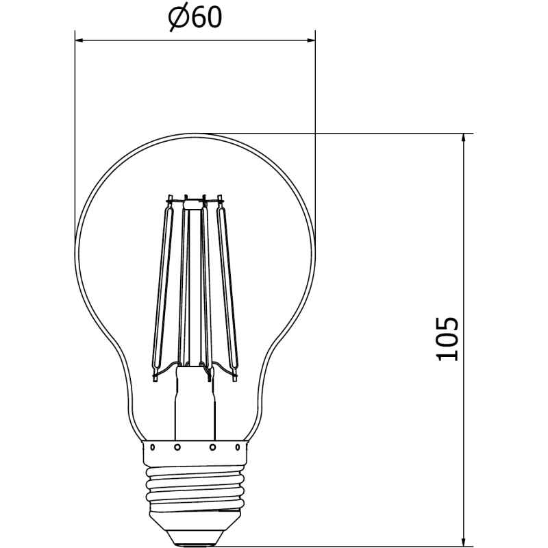 Dane techniczne: Wysokość: 105 mm Szerokość: 60 mm Rodzaj żarówki: A60 Rodzaj gwintu: E27 Moc: 8 W Równoważna moc: 75 W Strumień świetlny: 1055 lm Barwa światła: Ciepła Temperatura barwowa: 2700K Wskaźnik oddawania barw CRI: Ra ≥ 80 Możliwość ściemniania: Nie Kolor klosza: Clear Materiał klosza: Szkło Ilość sztuk w opakowaniu: 1 Kąt świecenia: 360º Napięcie: 220-240V Klasa energetyczna: E Zużycie energii: 8 kWh/1000 h Stopień ochrony: IP20 Certyfikaty: CE, RoHS