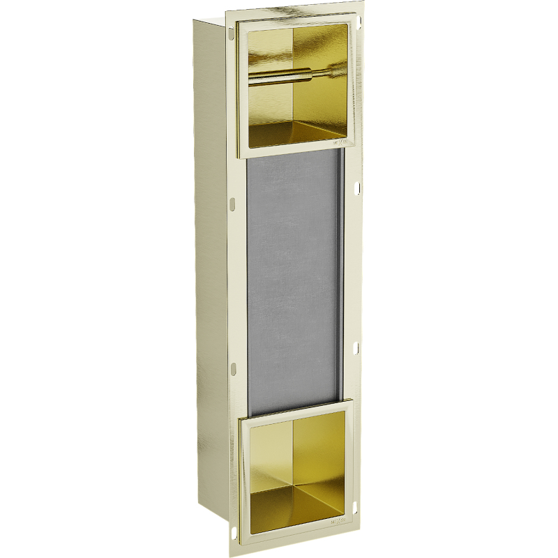 Dane techniczne: Materiał: Stal nierdzewna Wykończenie: Złoty szczotkowany Szerokość: 19,5 cm Wysokość: 74 cm Odległość od ściany: 12,1 cm Do zabudowy w ścianie - nie zabiera miejsca