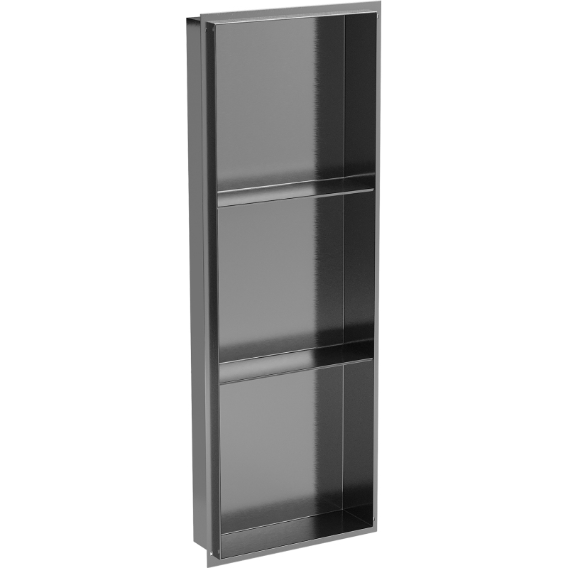 Dane techniczne: Materiał: Stal nierdzewna AISI 304 Szerokość: 90 x 30 cm Głębokość montażu: 10 cm Wykończenie: Gun gray szczotkowany Kołnierz maskujący: Nie Do zabudowy w ścianie Uniwersalne zastosowanie Odporność na matowienie i korozję