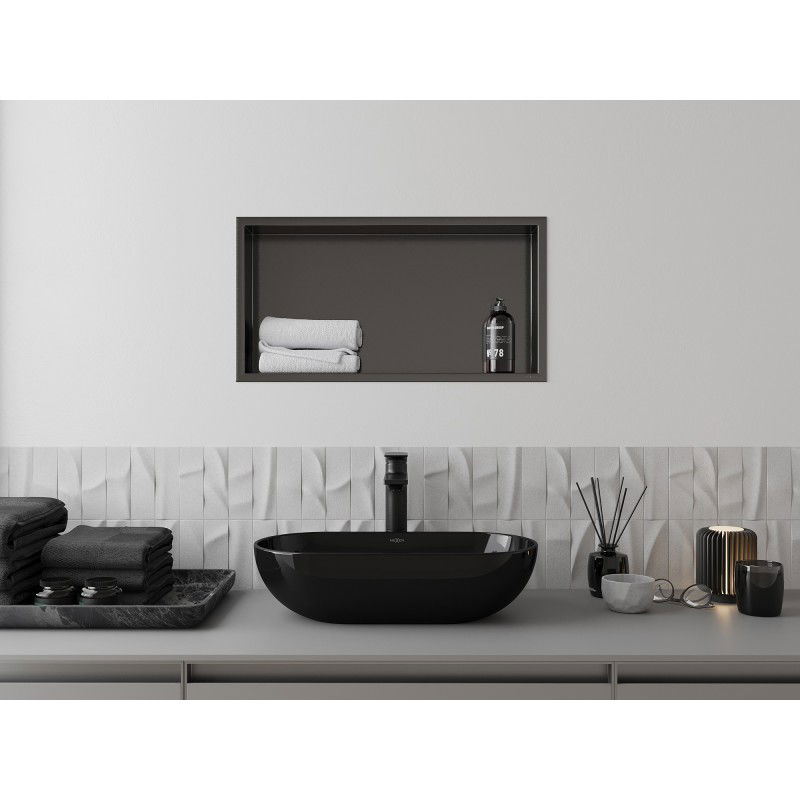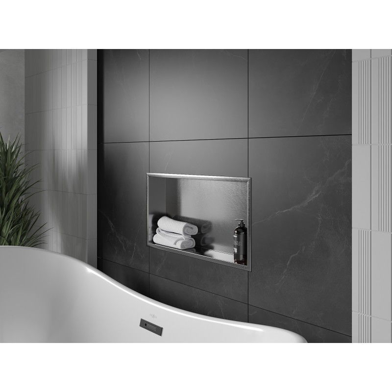 Specyfikacja produktu: Materiał: Stal nierdzewna AISI 304 Szerokość: 60 x 30 cm Głębokość montażu: 10 cm Wykończenie: Gun gray szczotkowany Kołnierz maskujący: Tak Do zabudowy w ścianie Uniwersalne zastosowanie Odporność na matowienie i korozję