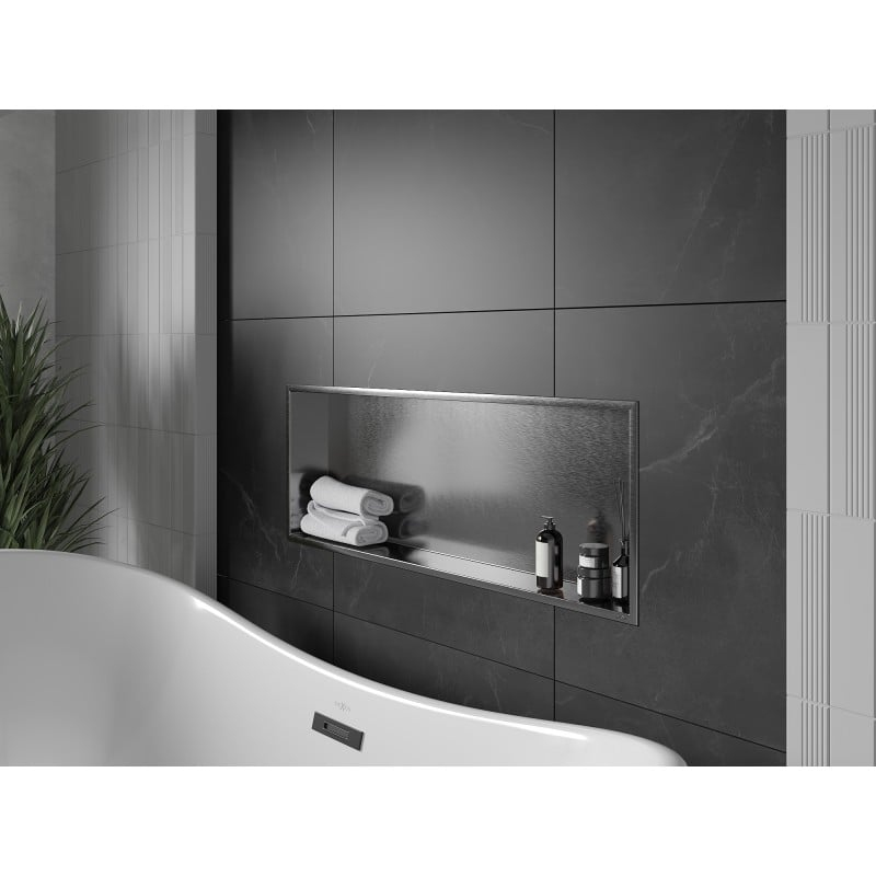 Specyfikacja produktu: Materiał: Stal nierdzewna AISI 304 Szerokość: 90 x 30 cm Głębokość montażu: 10 cm Wykończenie: Gun gray szczotkowany Kołnierz maskujący: Tak Do zabudowy w ścianie Uniwersalne zastosowanie Odporność na matowienie i korozję