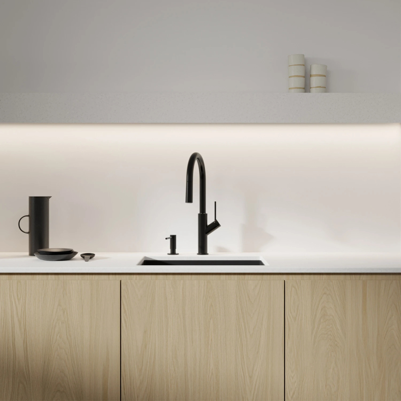 Dávkovač tekutého mýdla, navržený tak, aby pozvedl každodenní rituály jak v kuchyni, tak v koupelně, nabízí dokonalou rovnováhu mezi funkčností a stylem. Pomáhá udržovat pořádek a zároveň zajišťuje pohodlí a flexibilitu uspořádání. Jeho všestranná instalace – ať už na pracovní desce, umyvadle nebo kuchyňském dřezu – poskytuje plnou volnost v designu. Dávkovač je pečlivě sladěný s barevnými úpravami OMNIRES, který se bezproblémově integruje do vašeho interiéru, zatímco jeho ergonomický design zaručuje rychlý a bezproblémový přístup k mýdlu nebo prostředku na mytí nádobí kdykoli je to potřeba.