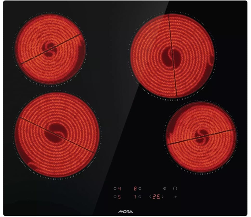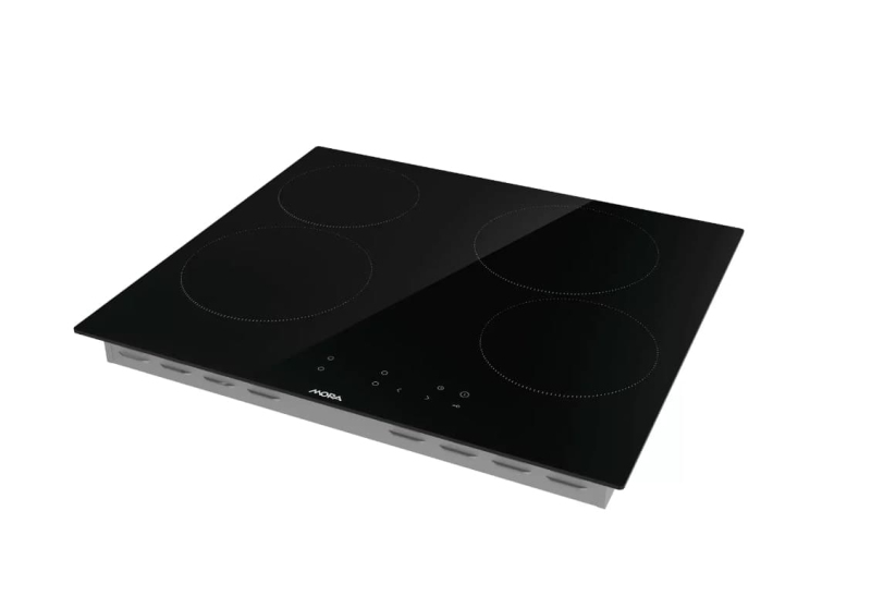 Sklokeramická varná deska MORA VDS 63 C v černém provedení s praktickými broušenými hranami, díky čemuž ji lze jednoduše zabudovat i do roviny s pracovní deskou, disponuje 4 Hi-Light varnými zónami.