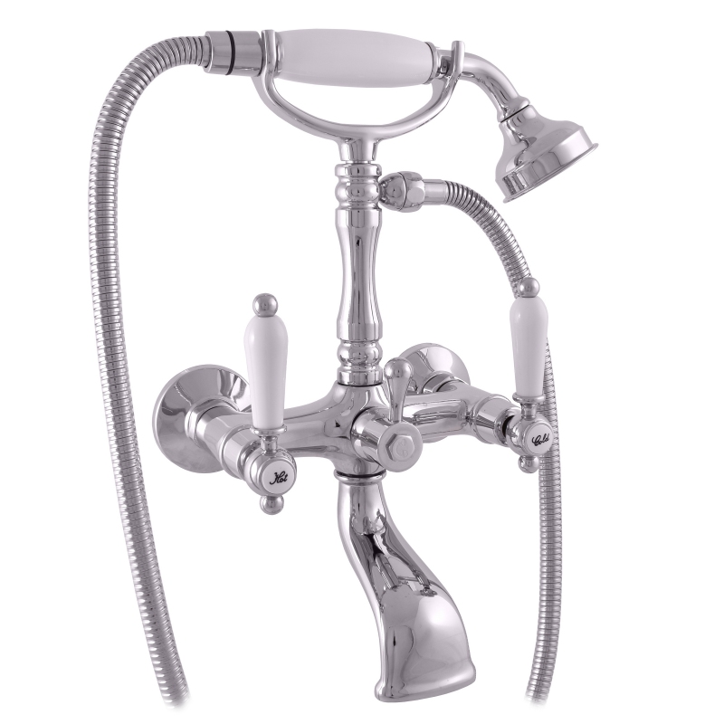 Vodovodní baterie vanová nástěnná s vidlicí na odkládání sprchy a se sprchou.
