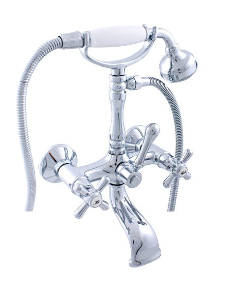 Vodovodní baterie vanová nástěnná s vidlicí na odkládání sprchy a se sprchou.