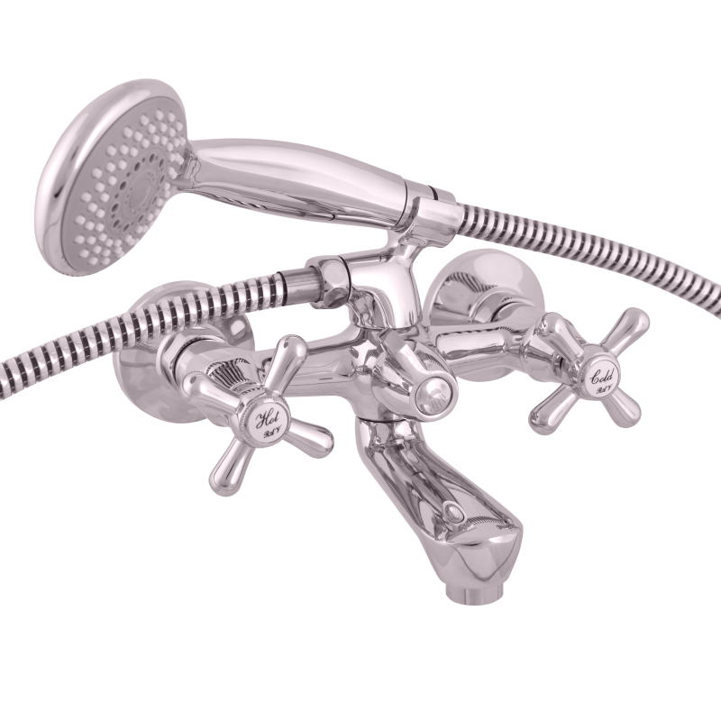 Vodovodní baterie vanová nástěnná s keramickým přepínačem, s vidlicí na odkládání sprchy a se sprchou.