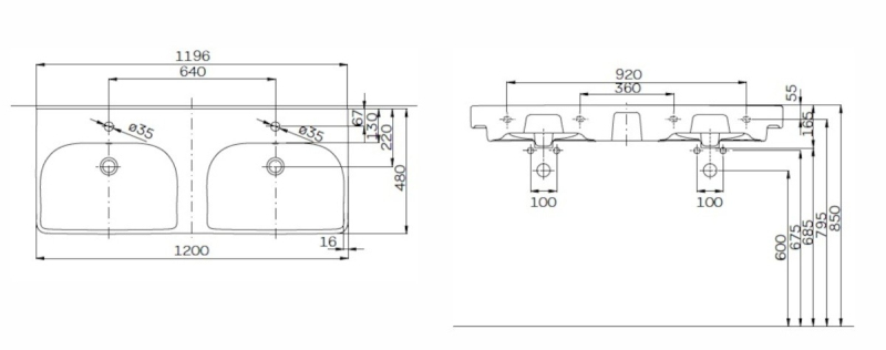 Nábytkové dvojumyvadlo se dvěma otvory pro baterii o šířce 120 cm, hloubce 48 cm a výšce 16,5 cm. Balení bez sifonu a baterie. Montážní sadu je nutné dokoupit.