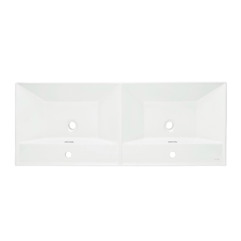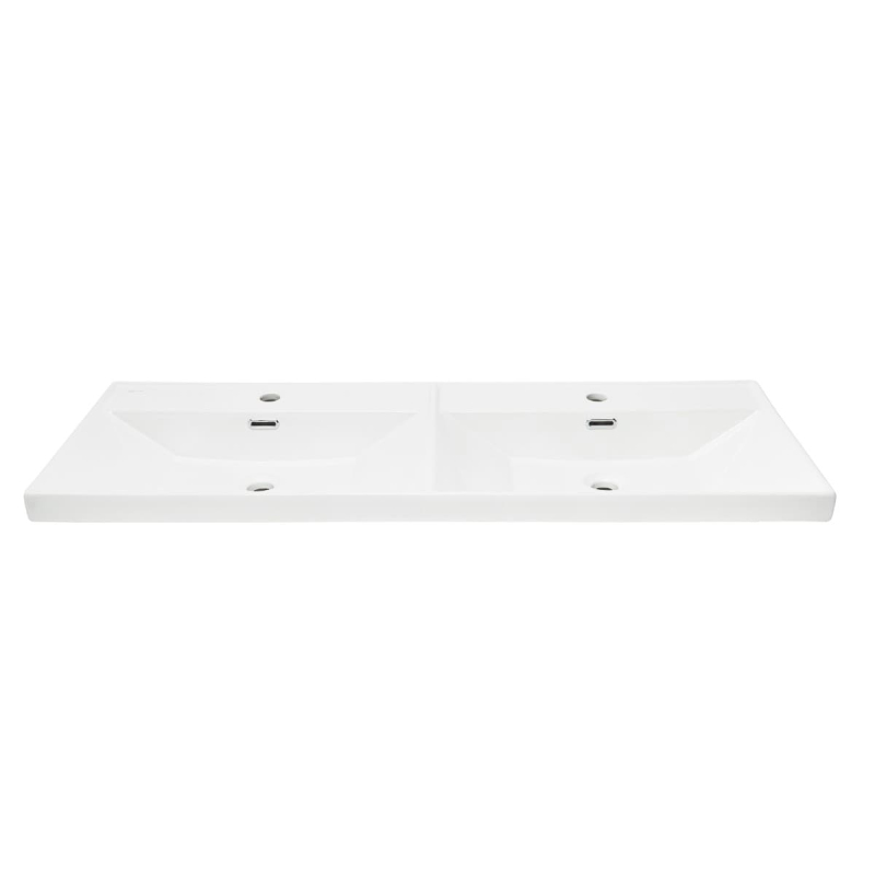 Nábytkové dvojumyvadlo v bílé barvě se dvěma otvroy pro baterii o šířce 121 cm a hloubce 46 cm. Balení bez sifonu a baterie.