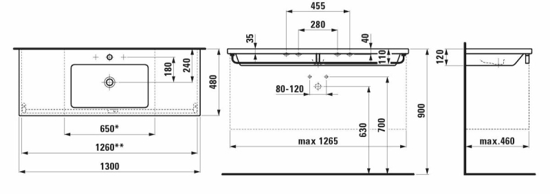 Nábytkové umyvadlo se třemi otvory pro baterii o šířce 130 cm, hloubce 48 cm a výšce 11 cm. Balení bez sifonu a baterie. Montážní sadu je nutné dokoupit.