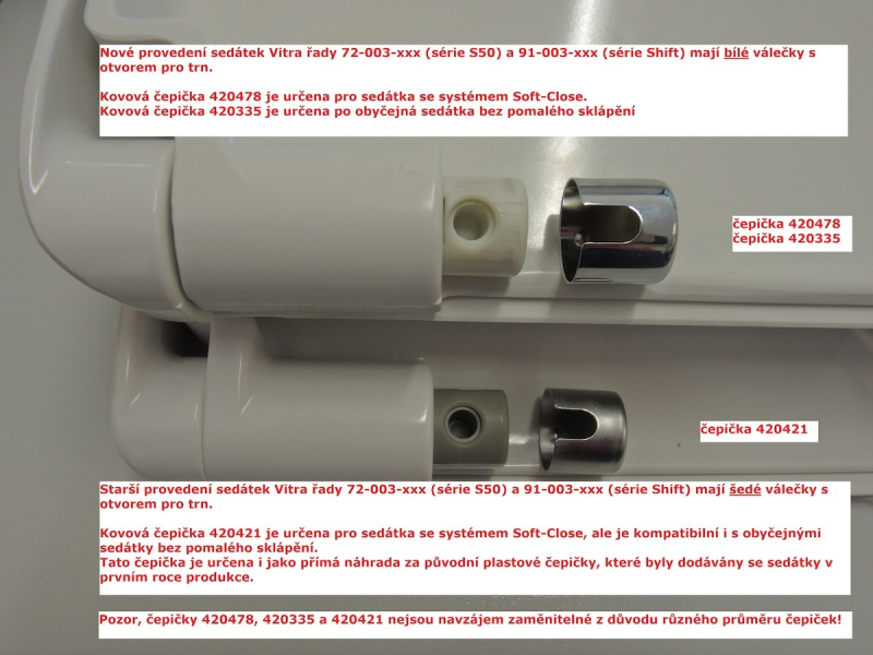 Pokud sedátko Vitra s tímto typem uchycení nedrží pevně na trnech, tak jsou pravděpodobně poškozené čepičky, které fungují jako zajištění sedátka proti vyskakování z trnů, které jsou připevněné na WC.Nejčastější důvod této závady je, když se uživatel pokouší při údržbě sedátko sundat z WC silným tahem přes nasazené čepičky, čímž se čepičky na sedátku poškodí a sedátko poté už nedrží na WC pevně zajištěné a vyskakuje z uchycení.Správný způsob demontáže sedátka z WC: Sundání čepiček Sundání sedátka z trnů Správný postup nasazení sedátka: Nasazení sedátka na trny Zajištění sedátka čepičkami Pozor, existují 3 velikosti čepiček a bližší popis naleznete na fotografii zboží