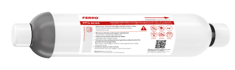 Filtr FFT4-ACAG je moderní řešení určené k výraznému zlepšení kvality vody z kohoutku. Je vybaven granulovaným aktivním uhlím impregnovaným stříbrem a účinně odstraňuje chlor, jeho deriváty a řadu organických sloučenin, které ovlivňují chuť a vůni vody. Díky tomu je každodenní používání vody jednoduše příjemnější. Přídavek nanostříbra má antibakteriální účinek – omezuje růst mikroorganismů uvnitř filtru a zajišťuje stabilní a hygienický provoz po celou dobu jeho životnosti. Toto řešení je obzvláště ceněno tam, kde je klíčová spolehlivost filtrace. Filtr je vybaven praktickou rychlospojkou 1/4", která zjednodušuje instalaci a zaručuje bezpečné a těsné spojení. Filtr FFT4-ACAG je plně kompatibilní s kuchyňskou baterií FILTRATA, čímž poskytuje účinný filtrační prvek a zlepšuje komfort každodenního používání vody v kuchyni.