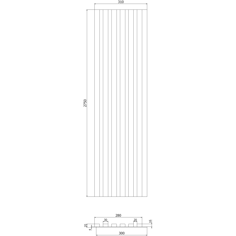 Specifikace produktu: Délka: 275 cm Šířka: 30 cm Tloušťka: 2 cm Tloušťka podstavce: 4 mm Tloušťka jedné lamely: 16 mm Šířka jedné lamely: 30 mm Vzdálenost mezi lamelami: 20 mm Počet lamel: 6 Materiál lamel: MDF lišta + technická dýha Podkladový materiál: HDF deska Konstrukce lamel: Dub Odstín lamel: Šedý Barva podkladu: Černá Způsob montáže: Lepením nebo šrouby