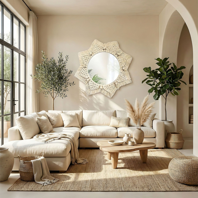 POZNÁMKA: Před pověšením vyčesejte třásně. Rám zrcadla je zhotoven z přírodních vláken vysoké kvality, zaručující mu krásnou a neopakovatelnou texturu a vlastní jedinečný charakter. Je ideální pro každou místnost; do obývacího pokoje, koupelny, kuchyně, předsíně, chodby, terasy či altánku — všude tam, kde sníte o výjimečném stylu Boho. Ručně tkaný rám zrcadla kromě stylového řešení nabízí také odvážnou kombinaci pozornost přitahujících barev a tradičního řemesla.