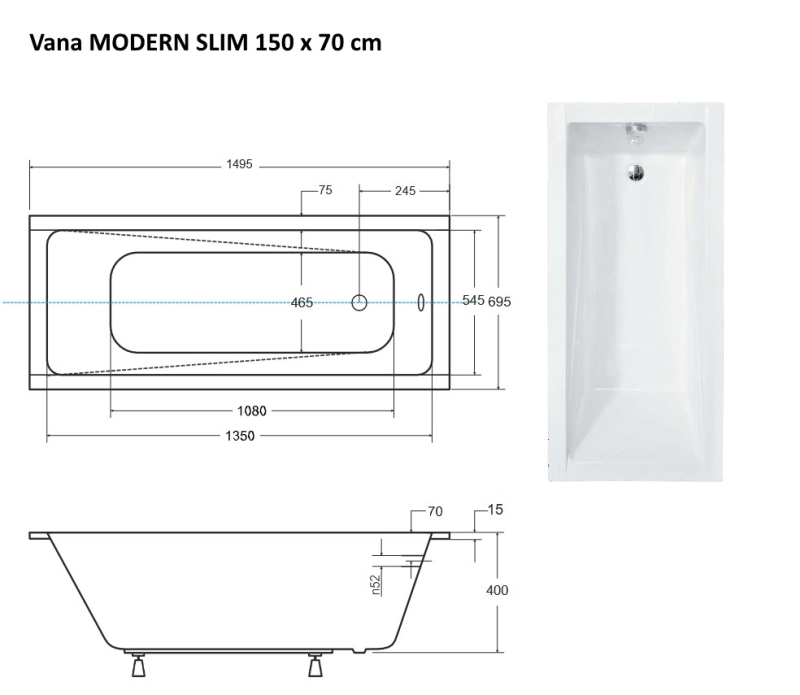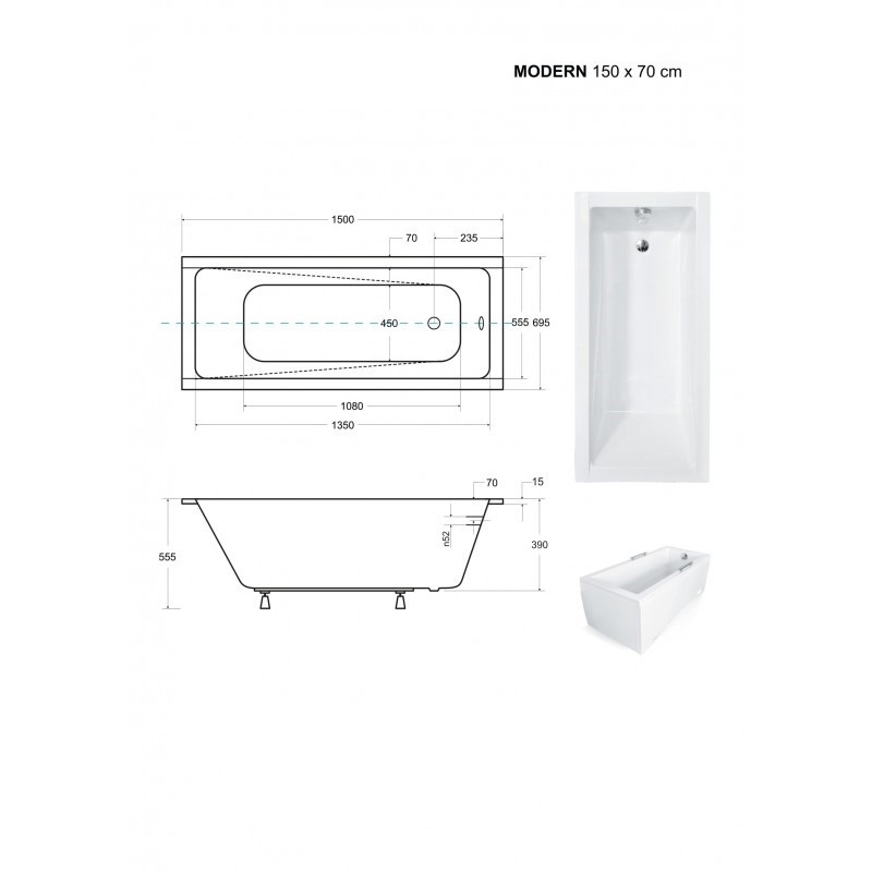 Obdélníková vana MODERN SLIM - 150 x 70 cm, s nožičkami