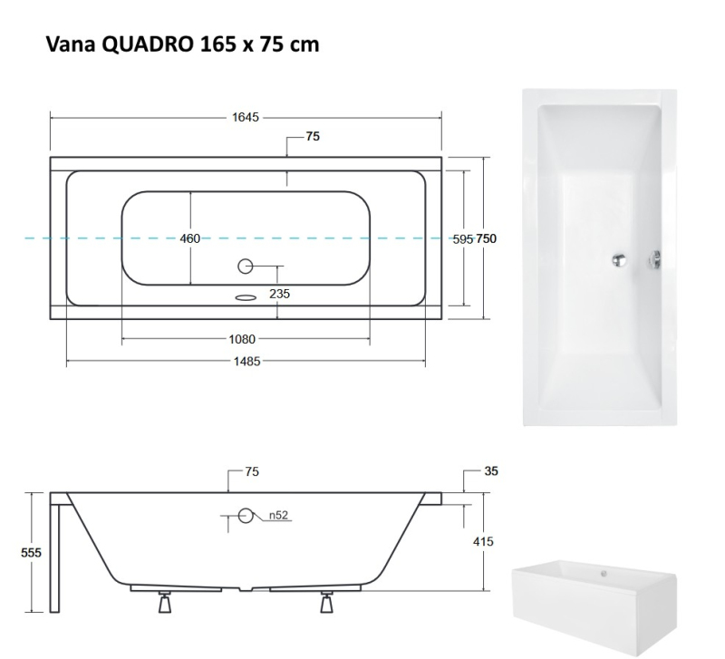 Obdélníková vana QUADRO - 165 x 75 cm, s nožičkami