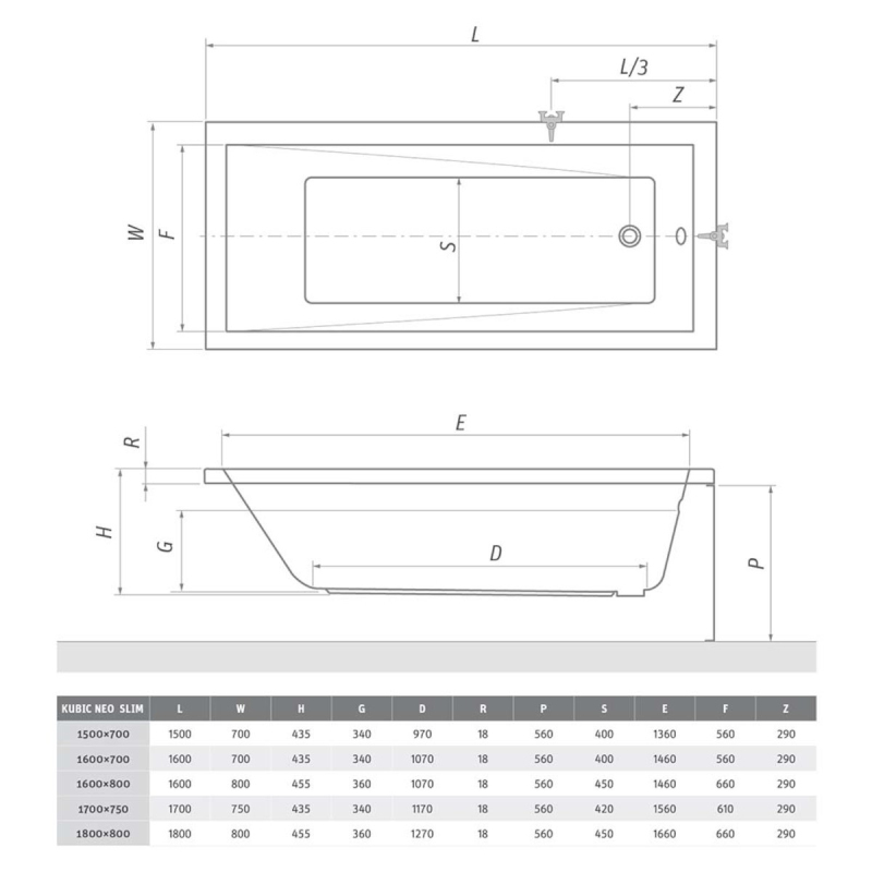 Obdélníková vana Roth Kubic Neo Slim 150x70 cm akrylát levá i pravá 9300SLM