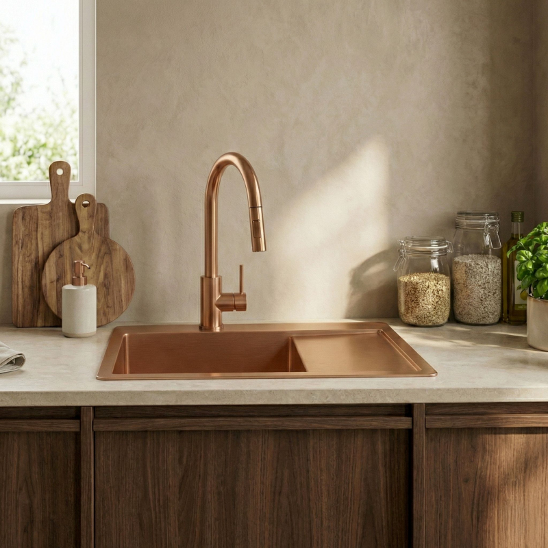 Ocelový dřez Fin v provedení broušená měď spojuje moderní design a praktičnost, díky čemuž se skvěle hodí do každé kuchyně. Je vyroben z vysoce kvalitní nerezové oceli AISI 304 (tloušťka 2 mm) a vyniká vysokou odolností proti korozi, poškrábání i vysokým teplotám, takže zůstává dlouhodobě odolný a spolehlivý. Hluboká, prostorná vana zajišťuje pohodlí při každodenním používání.Dřez je vybaven otvorem pro baterii, což umožňuje rychlou a snadnou montáž armatury. Produkt má odtok barevně sladěný s povrchovou úpravou, díky čemuž celek působí jednotně a elegantně.Hygienický povrch a snadné čištění hladkých prvků pomáhají udržet dřez v bezvadném stavu a omezují možnost rozvoje mikroorganismů.Produkt je dostupný ve dvou variantách: bez baterie nebo v setu s kuchyňskou baterií Fresh s vytahovací výpustí.