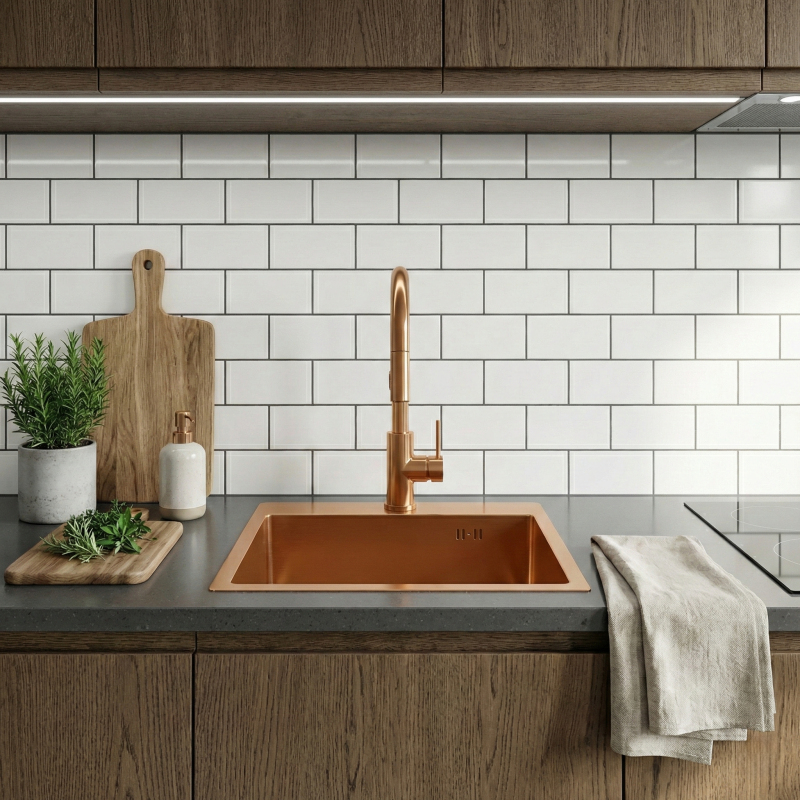 Ocelový dřez Leo 50 v provedení broušená měď spojuje moderní design a praktičnost, díky čemuž se skvěle hodí do každé kuchyně. Je vyroben z vysoce kvalitní nerezové oceli AISI 304 (tloušťka 2 mm) a vyniká vysokou odolností proti korozi, poškrábání i vysokým teplotám, takže zůstává dlouhodobě odolný a spolehlivý. Hluboká, prostorná vana zajišťuje pohodlí při každodenním používání.Dřez je vybaven otvorem pro baterii, což umožňuje rychlou a snadnou montáž armatury. Produkt má odtok barevně sladěný s povrchovou úpravou, díky čemuž celek působí jednotně a elegantně.Hygienický povrch a snadné čištění hladkých prvků pomáhají udržet dřez v bezvadném stavu a omezují možnost rozvoje mikroorganismů.Produkt je dostupný ve dvou variantách: bez baterie nebo v setu s kuchyňskou baterií Fresh s vytahovací výpustí.