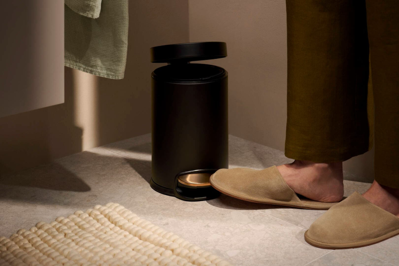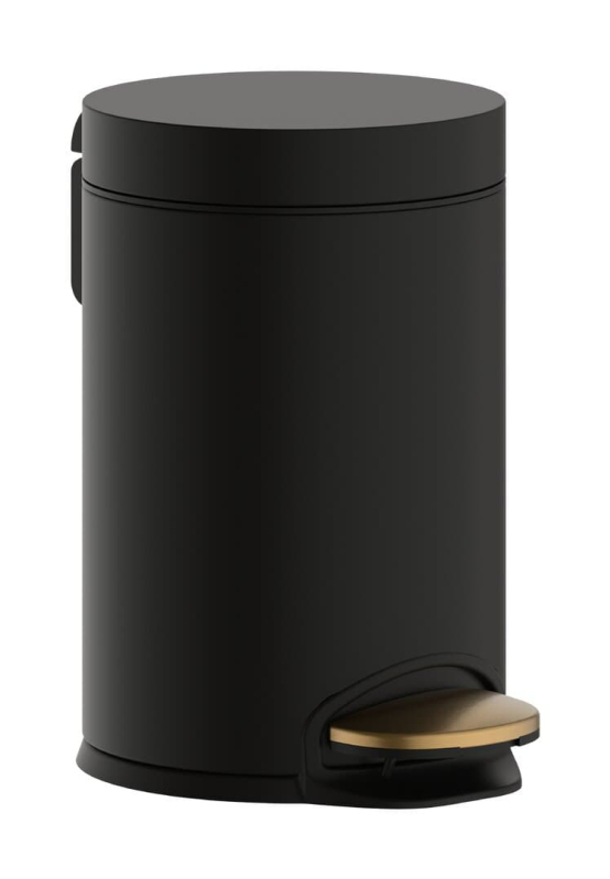 Volně stojící odpadkový koš od značky Hansgrohe s matným povrchem v barevném provedení kartáčovaný bronz. Udávaný objem produktu je 3 litrů.