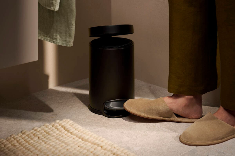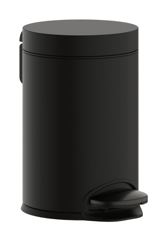 Volně stojící odpadkový koš od značky Hansgrohe s matným povrchem v barevném provedení černý chrom. Udávaný objem produktu je 3 litrů.
