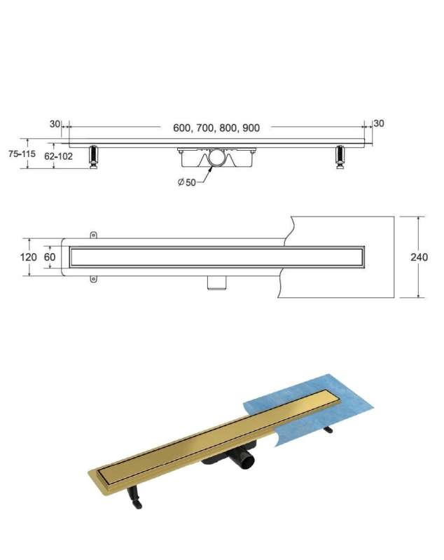 Kvalitně a moderně zpracovaný odtokový žlab. Tělo žlabu i vlastní rošt je vyroben z velice kvalitní nerezi a jsou oba s povrchovou úpravou ve zlaté barvě. Rošt lze použít buď pro vložení dlažby, nebo jako pohledový (zlatá barva). Tento žlab obohatí každou koupelnu o nádech luxusu. Sada obsahuje: žlab se sifonem a nožičkami, rošt a hydroizolační pásku.