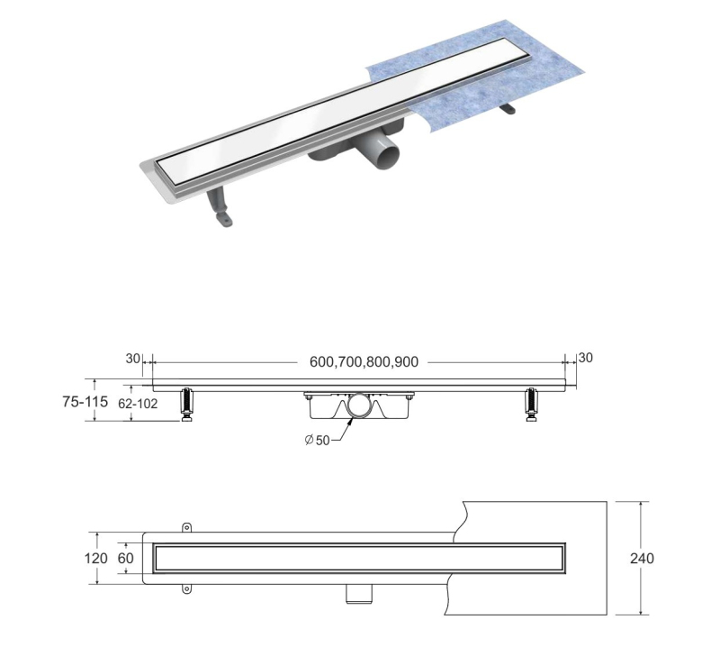 Kvalitně a moderně zpracovaný odtokový žlab, vyroben kombinací nerezu a roštu s bílým sklem obohatí každou koupelnu o nádech luxusu. Sada obsahuje: žlab se sifonem a nožičkami, rošt a hydroizolační pásku