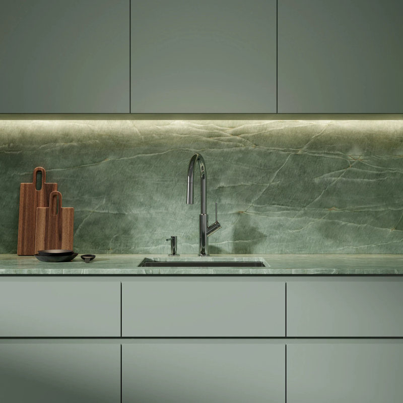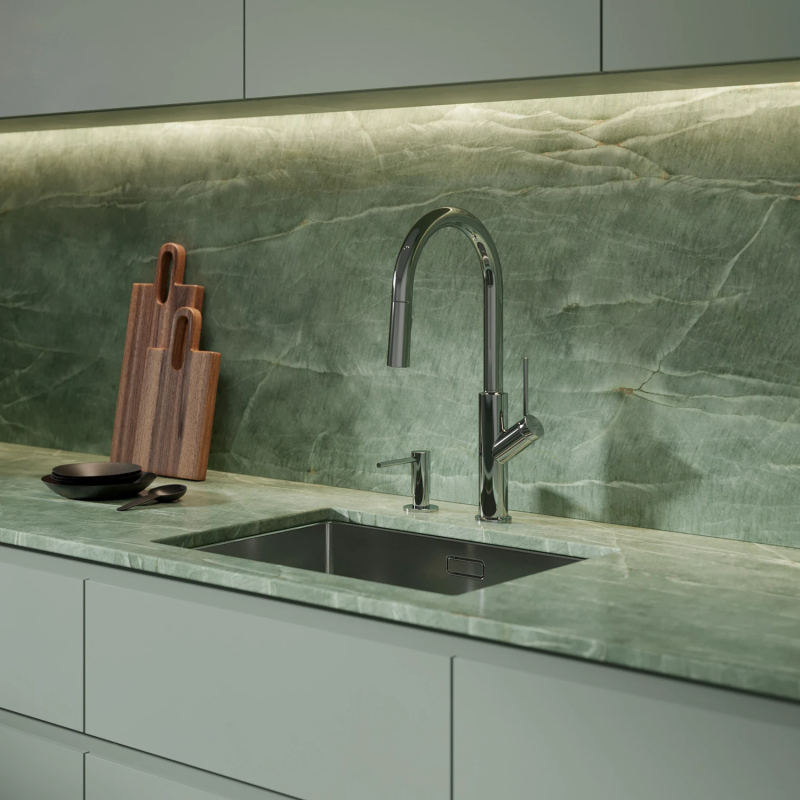 Kuchyňská dřezová baterie OMNIRES BEND se vyznačuje úchvatným, minimalistickým tvarem inspirovaným kruhy a oblouky. Baterie s výškou 44,4 cm, vybavená výsuvným otočným výtokem s dvoufunkčním rozprašovačem, zvyšuje dosah proudu vody a snadnost použití mixéru. Mixér je vyroben z vysoce kvalitní mosazi a je vybaven vysoce kvalitní keramickou kartuší. Inovativní technologická řešení zajišťují nejvyšší komfort používání a snižují spotřebu vody o 50 %.