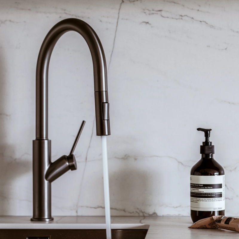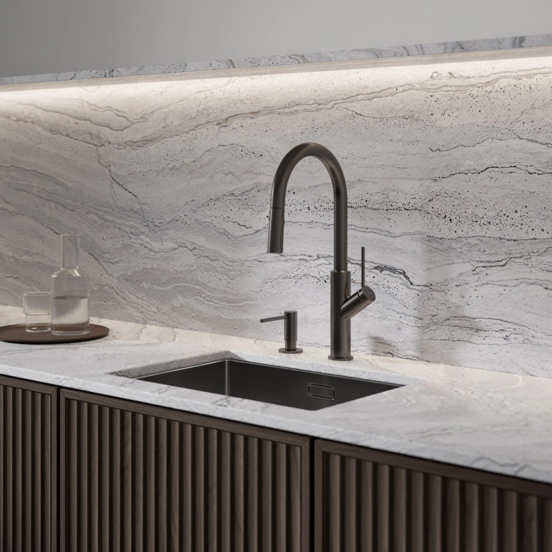 Kuchyňská dřezová baterie OMNIRES BEND se vyznačuje úchvatným, minimalistickým tvarem inspirovaným kruhy a oblouky. Baterie s výškou 44,4 cm, vybavená výsuvným otočným výtokem s dvoufunkčním rozprašovačem, zvyšuje dosah proudu vody a snadnost použití mixéru. Mixér je vyroben z vysoce kvalitní mosazi a je vybaven vysoce kvalitní keramickou kartuší. Inovativní technologická řešení zajišťují nejvyšší komfort používání a snižují spotřebu vody o 50 %.