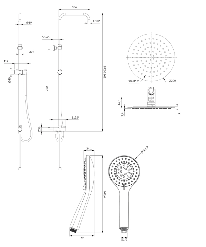 sprchový sloup (UN10041CR) s přepínačem a ramenem sprchové hlavice