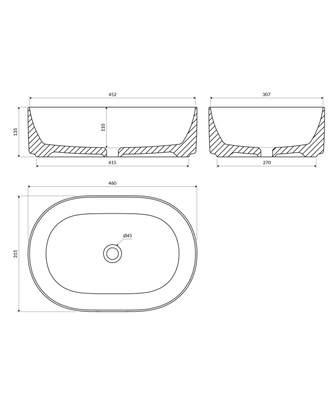 Umyvadlo má výšku 13,5 cm a není vybaveno přepadem. Při instalaci je třeba si zvolit odpadový systém zvlášť, protože není součástí dodávky.