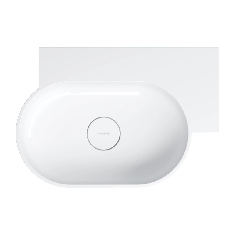 Umyvadlo z kolekce OMNIRES OVO se vyznačuje minimalistickou a expresivní siluetou s bezchybnými proporcemi. Design, zrozený z hravého přístupu ke geometrii, kombinuje dva protilehlé půlkruhy mísy s obdélníkovou, funkční poličkou – ideální prostor pro instalaci baterie i pro odložení kosmetiky či jiných nezbytností denní potřeby. Harmonicky tvarované stěny končí plochým okrajem, který zdůrazňuje tvar umyvadla, zatímco dokonale sladěný kryt odtoku zaručuje bezchybnou estetiku. Diskrétní, továrně vyrobený podříznutý bod na spodní straně označuje, kde lze vyříznout otvor pro baterii.