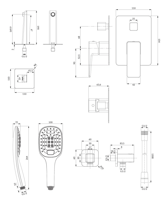 ruční sprcha (DAVIS-RCRB), 3 funkce, proudy: déšť, masáž, smíšený
