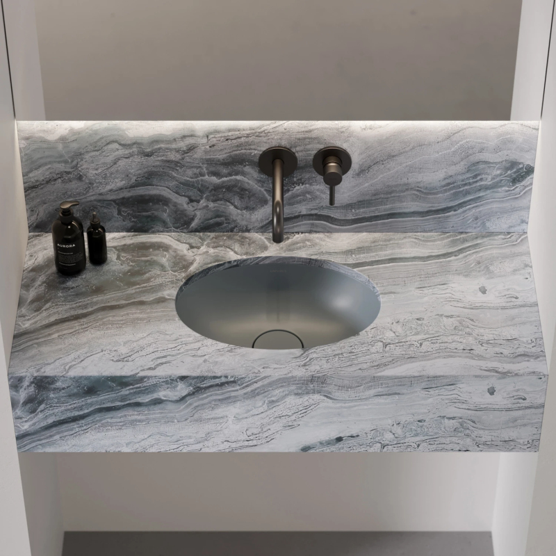 Umyvadlo pod desku z kolekce OMNIRES SHELL M+ se vyznačuje elegantním, moderním eliptickým designem, který se jemně zužuje směrem ke dnu. Díky kompaktním rozměrům je ideální volbou pro malé koupelny a toalety. Přesně navržený okraj umožňuje montáž umyvadla pod pracovní desku, což zajišťuje hladký a jednotný povrch. Alternativně lze umyvadlo instalovat v jedné rovině s pracovní deskou, přičemž na povrchu je viditelný pouze minimalistický okraj. Obě montážní řešení zjednodušují každodenní údržbu a maximalizují prostor, díky čemuž je umyvadlo ideální volbou pro interiéry, které si cení pečlivých detailů a efektivního využití prostoru.