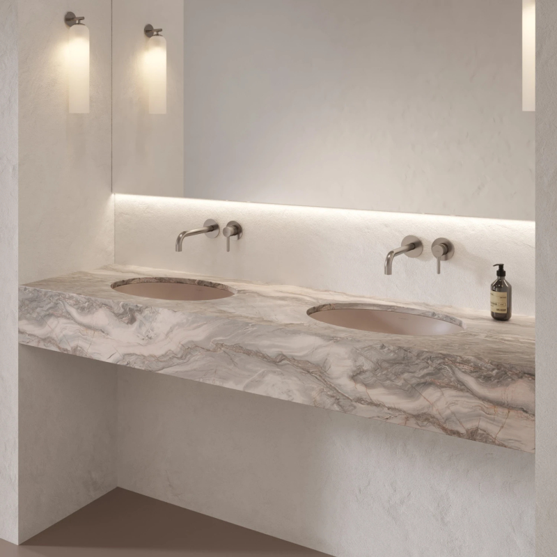 Umyvadlo pod desku z kolekce OMNIRES SHELL M+ má elegantní, moderní eliptický design, který se jemně zužuje směrem ke dnu. Jeho optimální rozměry jsou ideální pro koupelny s jednoduchými i dvojitými umyvadly. Přesně navržený okraj umožňuje montáž umyvadla pod pracovní desku, což zajišťuje hladký a jednotný povrch. Alternativně lze umyvadlo instalovat v jedné rovině s pracovní deskou, přičemž na povrchu je viditelný pouze minimalistický okraj. Obě montážní řešení nejen usnadňují každodenní péči, ale také optimálně využívají prostor, díky čemuž je umyvadlo ideální volbou pro moderní a minimalistické interiéry.