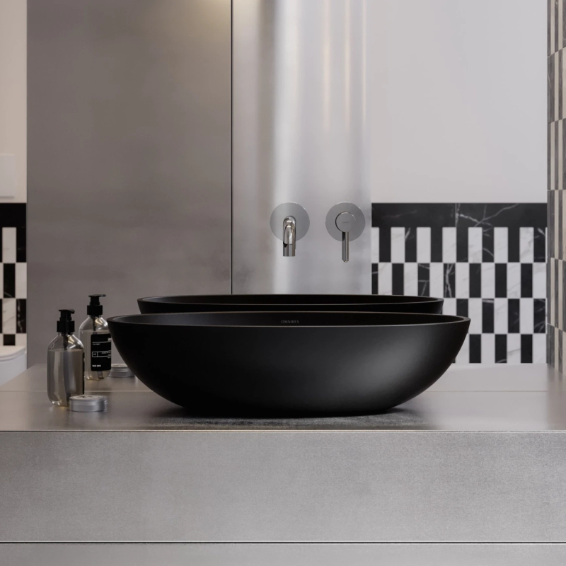 Umyvadlo na desku z kolekce OMNIRES SHELL M+ se vyznačuje současným eliptickým tvarem, který se k základně jemně zužuje. Minimalistické tělo umyvadla má lehký, ale pevný vzhled a vytváří efekt monolitu vytesaného ze skály. Nádrž je vyrobena z kompozitního materiálu (M+), jehož hlavní složkou je dolomit. Inovativní výrobní technologie zaručuje dokonalé provedení každého detailu a zároveň zajišťuje pozoruhodnou životnost a odolnost. Umyvadlo SHELL v černé lávě má hedvábně hladký matný povrch v dramatickém odstínu černé.
