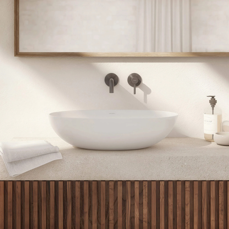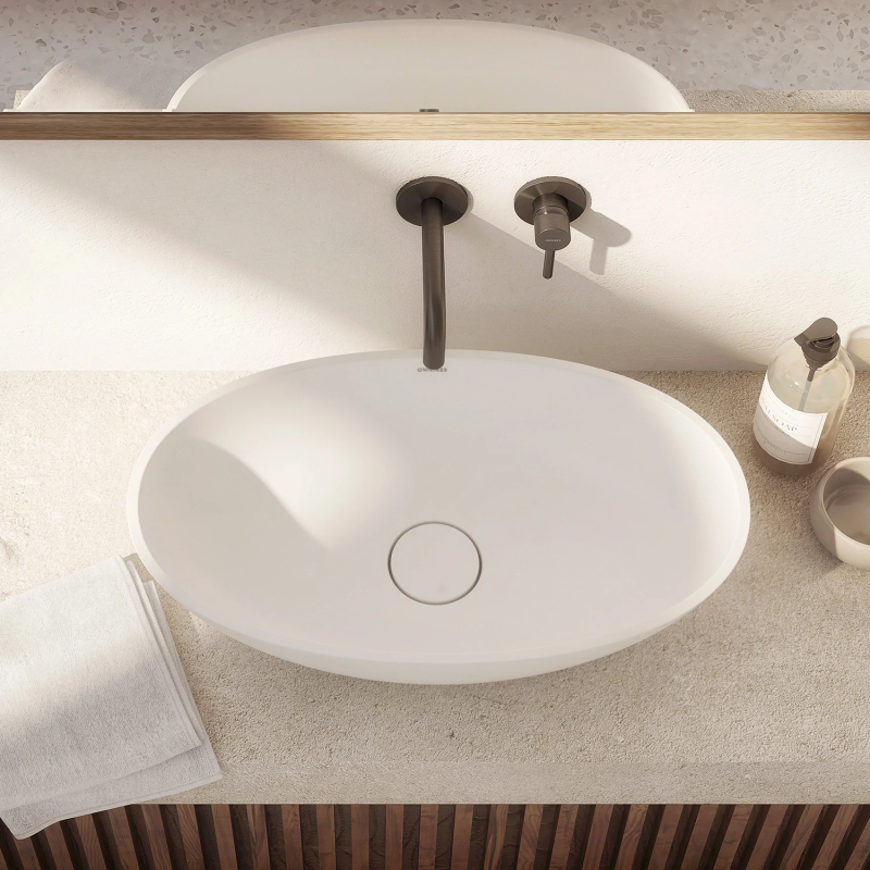 Umyvadlo na desku z kolekce OMNIRES SHELL M+ se vyznačuje současným eliptickým tvarem, který se k základně jemně zužuje. Minimalistické tělo umyvadla má lehký, ale pevný vzhled a vytváří efekt monolitu vytesaného ze skály. Odpadní kryt diskrétně skryje odpad, aniž by narušil harmonicky tvarovaný tvar umyvadla.