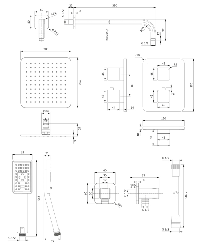Součástí tohoto systému je termostatická sprchová/vanová baterie pro podomítkovou instalaci, která umožňuje plynulé nastavení teploty vody. Dále je zde mosazná sprchová hlavice s rozměry 20 x 20 cm, která poskytuje příjemný sprchový zážitek. K systému patří také mosazné sprchové rameno, které umožňuje sprchovou hlavici umístit do ideální polohy.